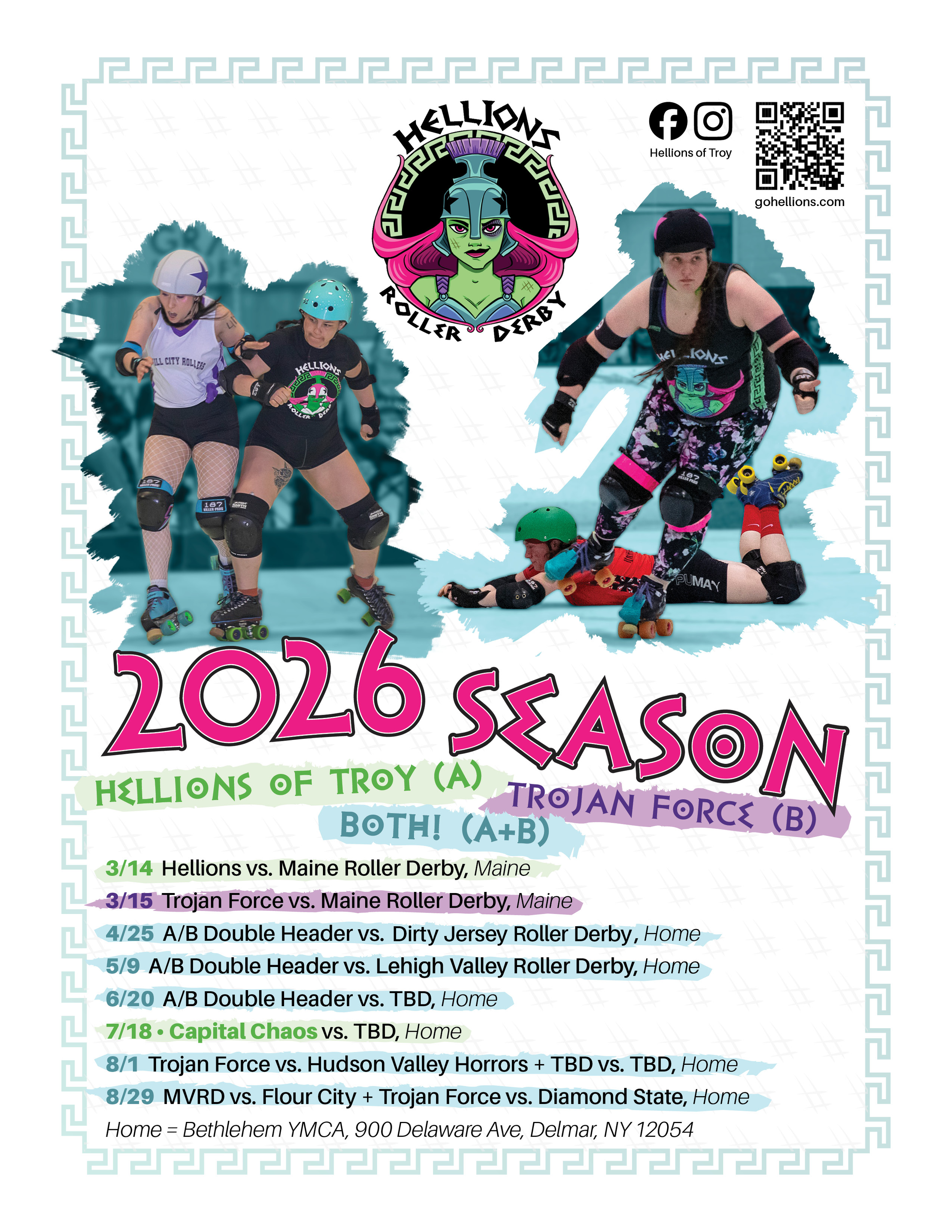 The Hellions Of Troy Roller Derby League was founded in Troy, NY but currently practice out of Rollarama Skating Center, 2710 Hamburg Street, Schenectady, NY 12303. Home bouts are hosted at the Bethlehem YMCA, 900 Delaware Ave, Delmar, NY 12054